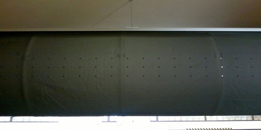 Als kostensparende Lösung, die auch eine kurze Montagezeit garantierte, erfolgt die Zuluftverteilung über schwarze, textile Schläuche. Diese werden außerhalb des Betriebes formstabil gehalten und passen sich so in die Saalarchitektur als modernes Element ein.