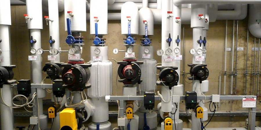 Die Wärmeversorgung erfolgt zum einen über eine Wärmeleitung aus der bestehenden Heizzentrale. Zum anderen wird eine Sole-Wasser-Wärmepumpe eingesetzt.