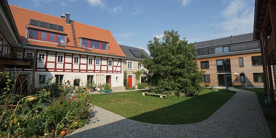 Der Vierseithof bietet nach Sanierung der Gebäude und dem Passivhaus-Neubau der Scheune insgesamt Wohnungen für 15 Familien.